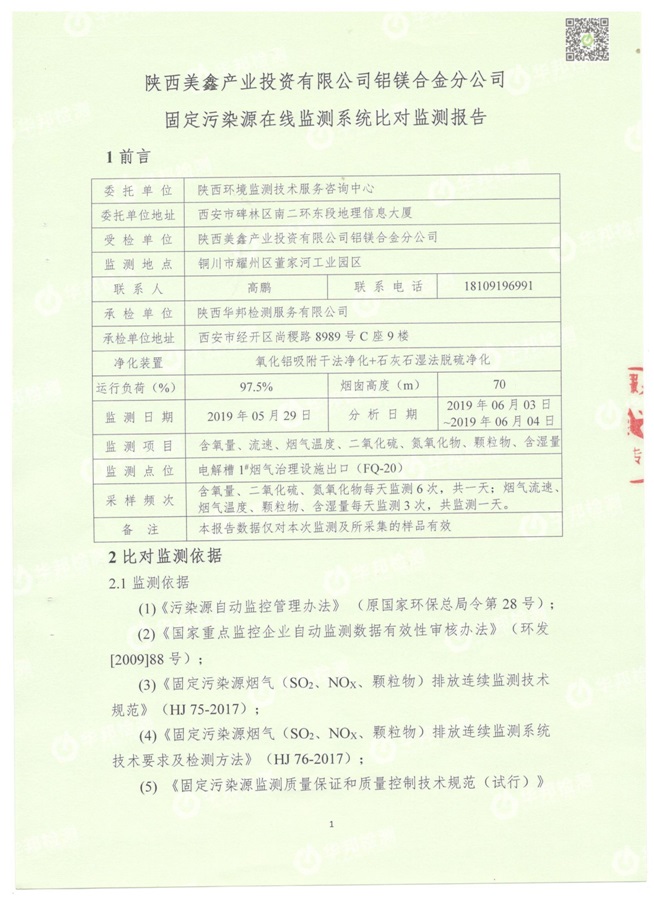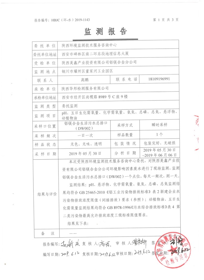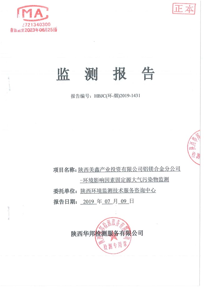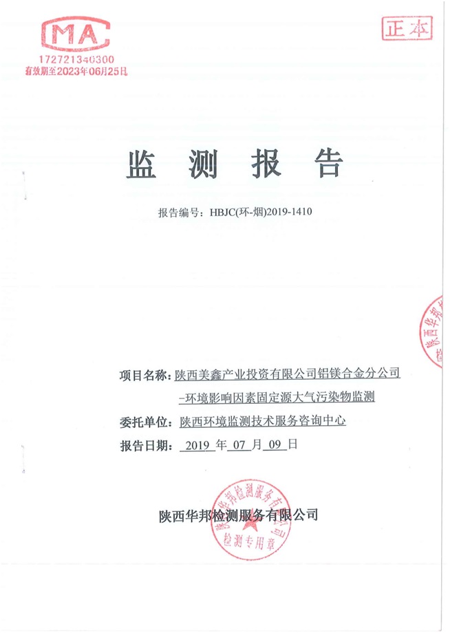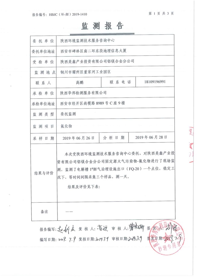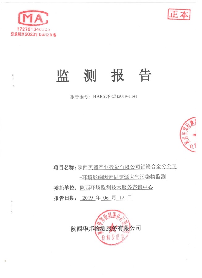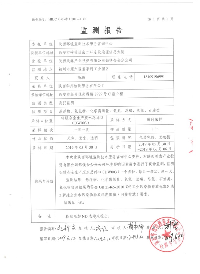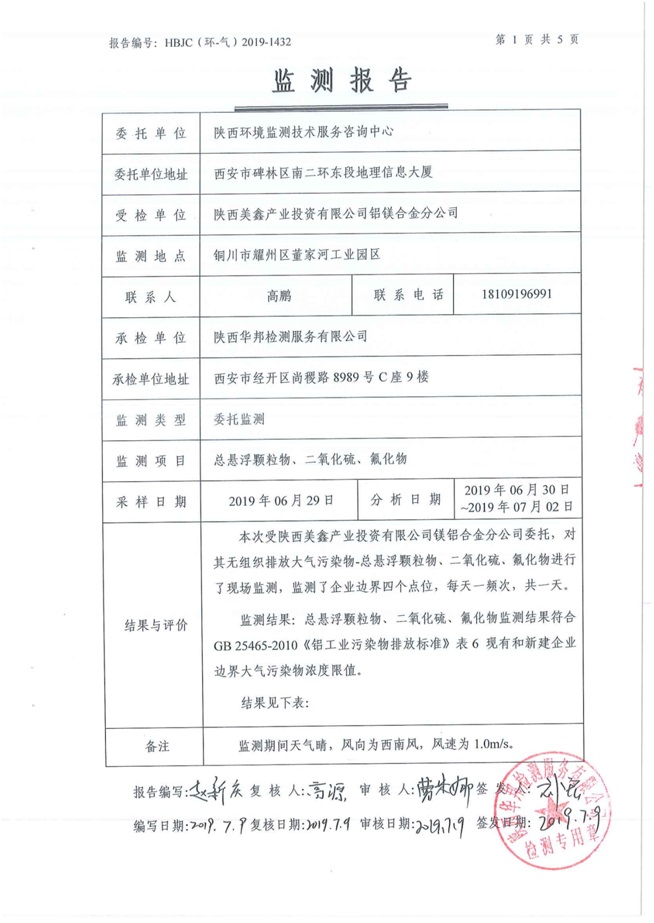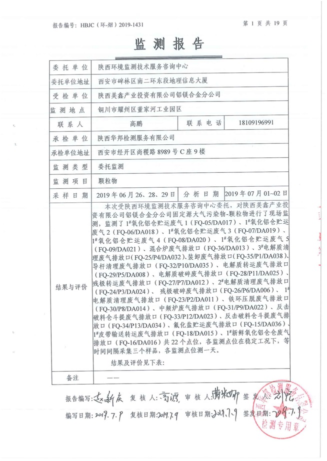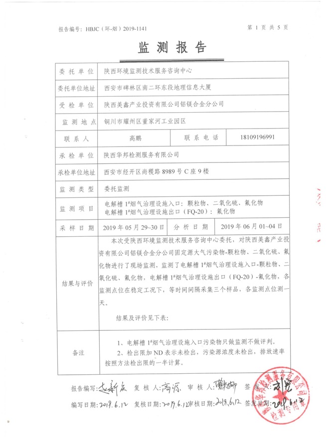 一、基礎信息: 陜西美鑫產業投資有限公司 統一社會信用代碼:91610200567136996Y 法定代表人:高曉兵 生產地址:陜西省銅川市董家河工業園區 聯系方式:09196982605 生產經營和管理服務的主要內容、產品及規模: 美鑫公司在陜西有色、陜西煤化兩大集團的正確領導下,在銅川市委、市政府的關心支持下,充分利用銅川資源型城市轉型政策,依托園區區位優勢,擬投資150億元,建設年產30萬噸預焙陽極、120萬噸煤礦、30萬噸鋁鎂合金及配套動力站、20萬噸鋁深加工、年吞吐量500—800萬噸物流園等循環經濟項目。該集群項目已被列入《陜西省國民經濟和社會發展第十二個五年規劃綱要》,為陜西省“58123”項目之一。美鑫公司以循環經濟為路徑,堅持經濟增長與環境保護協調發展,聚合資源與資本,走綠色發展、清潔發展、低碳發展的循環經濟轉型升級之路。 陜西美鑫鋁鎂合金分公司采用的500kA預焙陽極電解槽,自動化程度高,電解槽打殼、加料全過程均由微機自動控制,從而使槽罩開啟次數顯著降低,電解槽集氣效率能夠達到99%,大大地減少了煙氣無組織排放。項目配置了2套電解煙氣凈化系統,經捕集的煙氣通過排煙支管進入排煙總管,采用電解鋁生產原料—氧化鋁吸附阻濾煙氣中的氟化氫氣體及含氟煙塵,吸附后的載負氧化鋁進入袋式除塵器,經氣固分離后進入石灰石—石膏脫硫系統脫硫。 陜西美鑫產業投資有限公司鋁鎂合金分公司2019年2季度自行監測如下: 二、監測方案: 1 大氣污染源監測