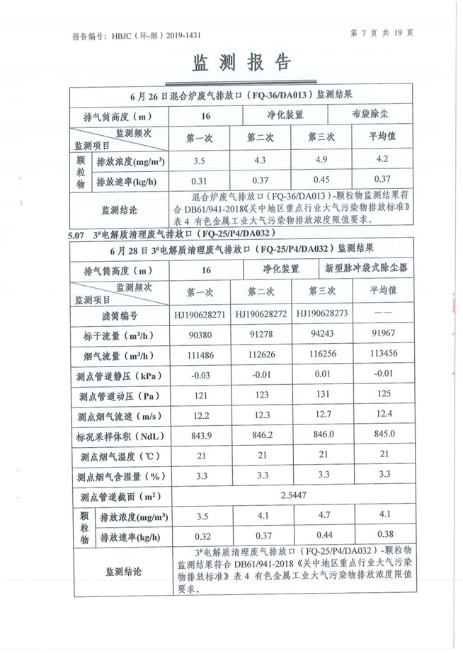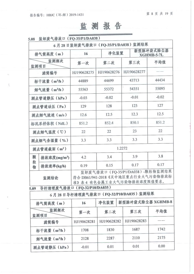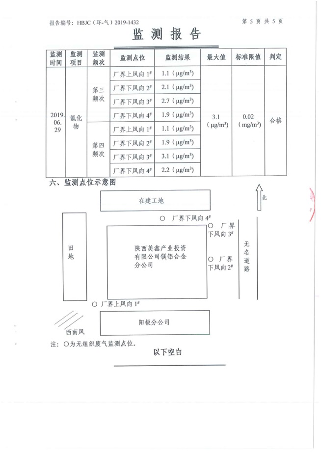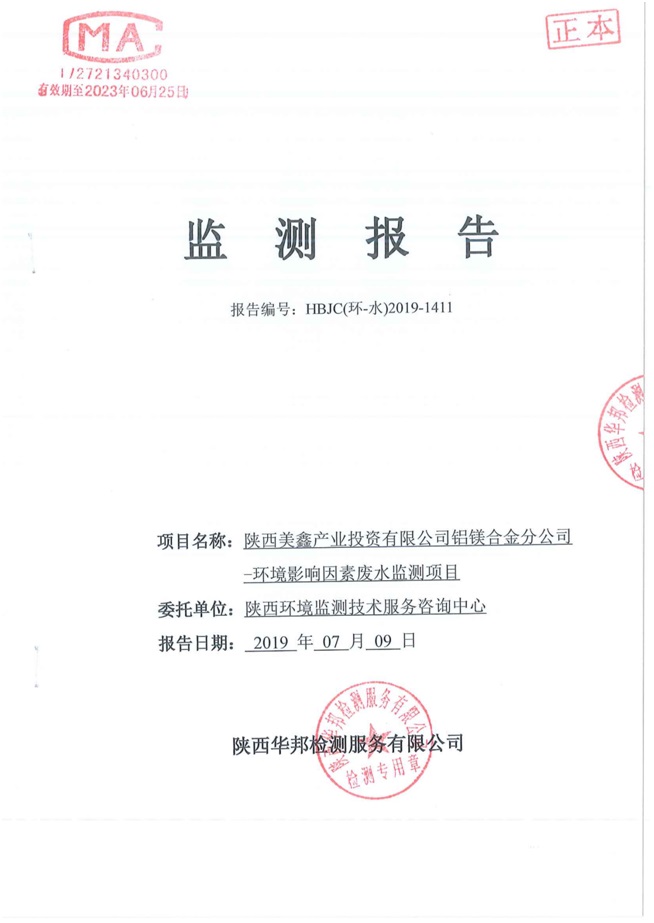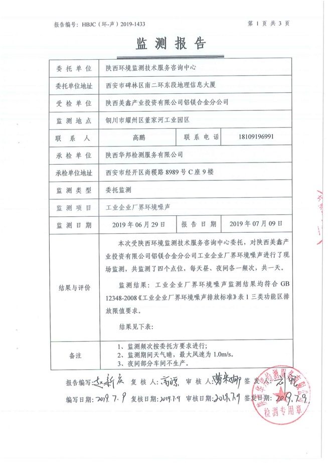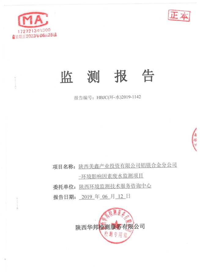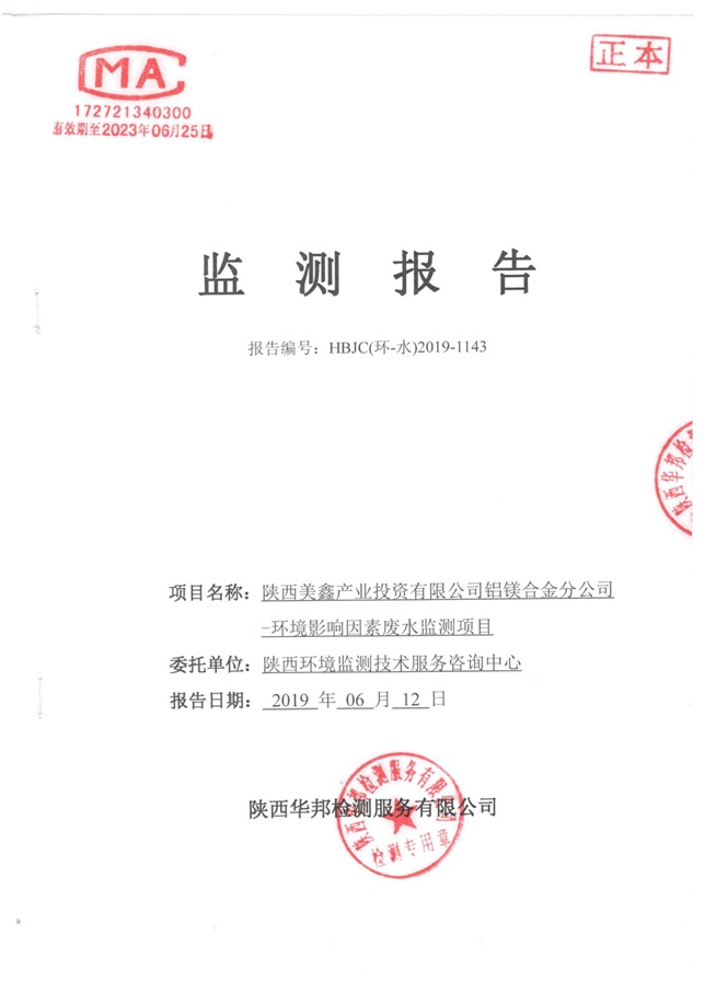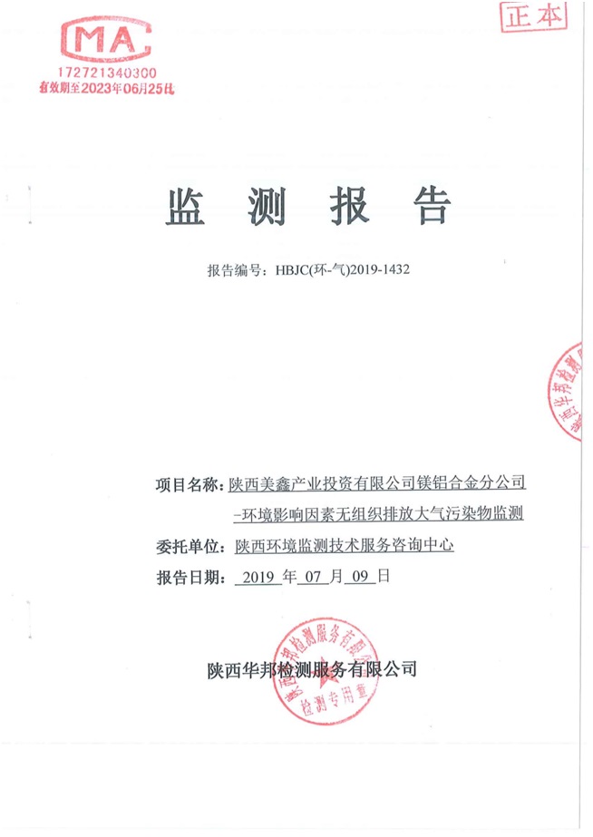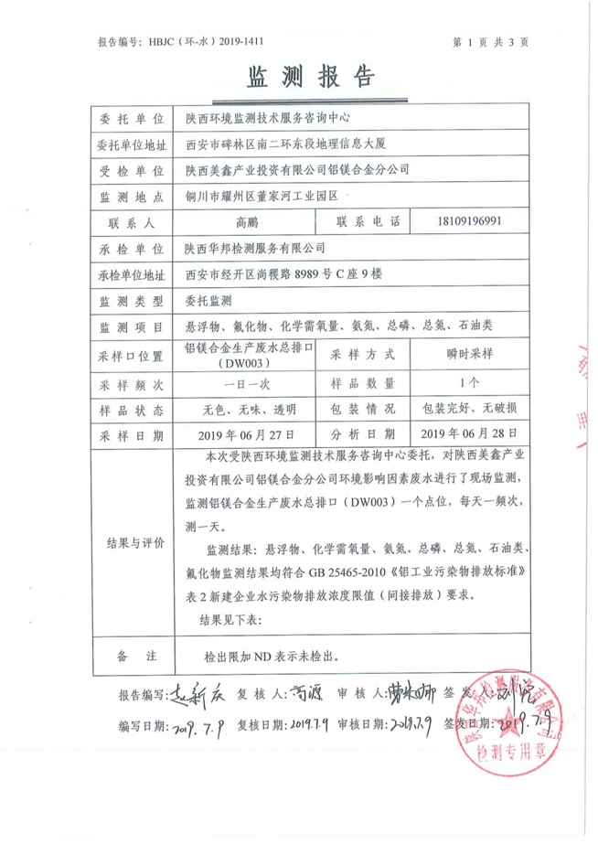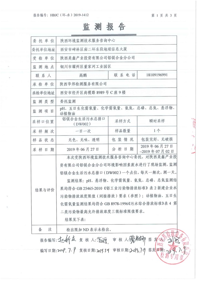 一、基礎信息: 陜西美鑫產業投資有限公司 統一社會信用代碼:91610200567136996Y 法定代表人:高曉兵 生產地址:陜西省銅川市董家河工業園區 聯系方式:09196982605 生產經營和管理服務的主要內容、產品及規模: 美鑫公司在陜西有色、陜西煤化兩大集團的正確領導下,在銅川市委、市政府的關心支持下,充分利用銅川資源型城市轉型政策,依托園區區位優勢,擬投資150億元,建設年產30萬噸預焙陽極、120萬噸煤礦、30萬噸鋁鎂合金及配套動力站、20萬噸鋁深加工、年吞吐量500—800萬噸物流園等循環經濟項目。該集群項目已被列入《陜西省國民經濟和社會發展第十二個五年規劃綱要》,為陜西省“58123”項目之一。美鑫公司以循環經濟為路徑,堅持經濟增長與環境保護協調發展,聚合資源與資本,走綠色發展、清潔發展、低碳發展的循環經濟轉型升級之路。 陜西美鑫鋁鎂合金分公司采用的500kA預焙陽極電解槽,自動化程度高,電解槽打殼、加料全過程均由微機自動控制,從而使槽罩開啟次數顯著降低,電解槽集氣效率能夠達到99%,大大地減少了煙氣無組織排放。項目配置了2套電解煙氣凈化系統,經捕集的煙氣通過排煙支管進入排煙總管,采用電解鋁生產原料—氧化鋁吸附阻濾煙氣中的氟化氫氣體及含氟煙塵,吸附后的載負氧化鋁進入袋式除塵器,經氣固分離后進入石灰石—石膏脫硫系統脫硫。 陜西美鑫產業投資有限公司鋁鎂合金分公司2019年2季度自行監測如下: 二、監測方案: 1 大氣污染源監測