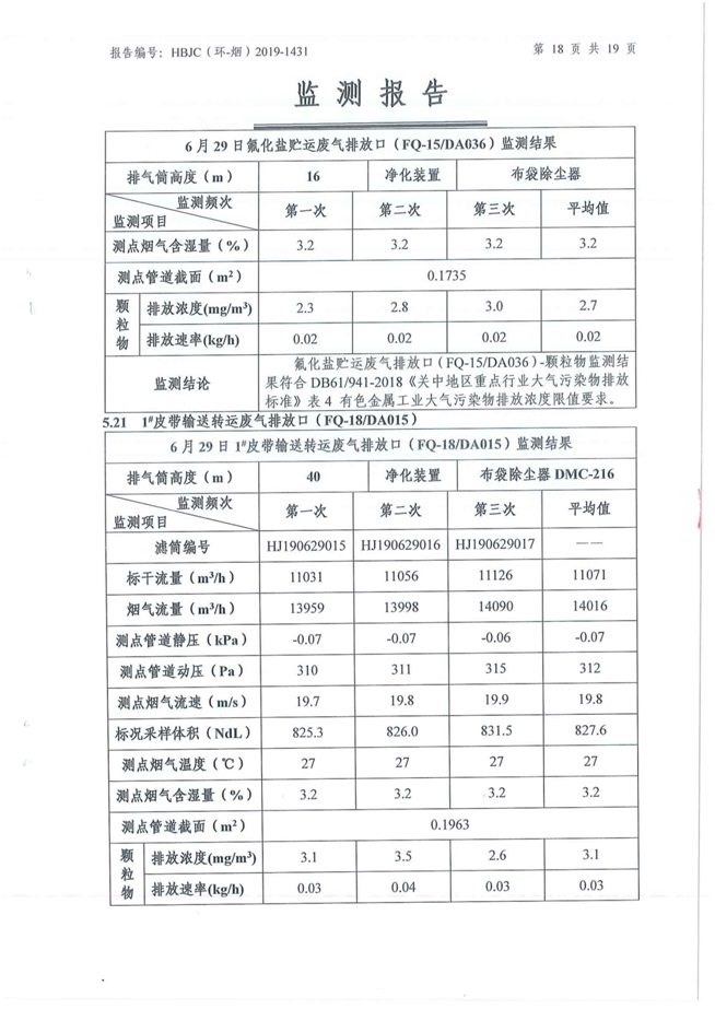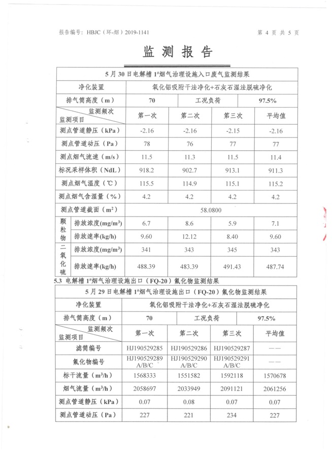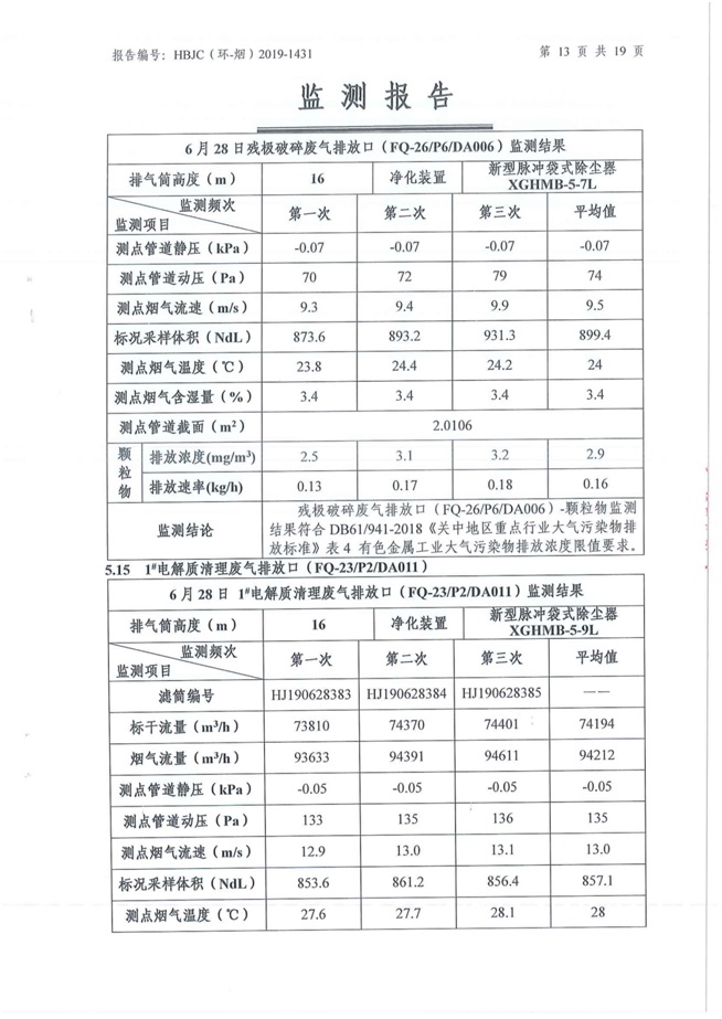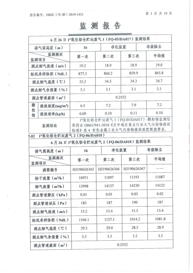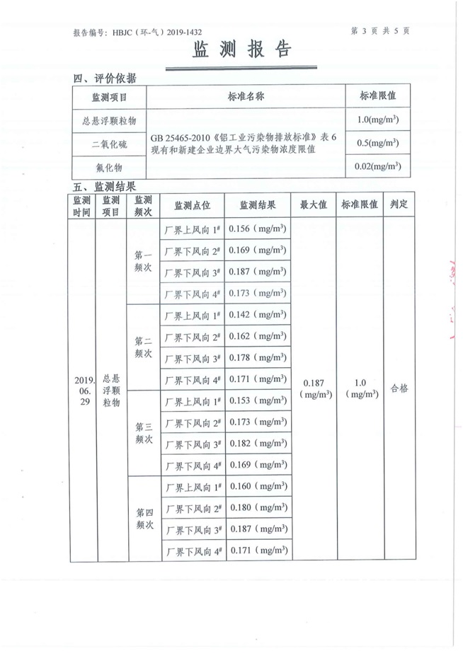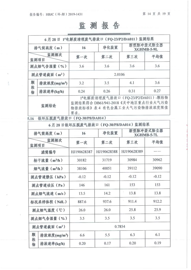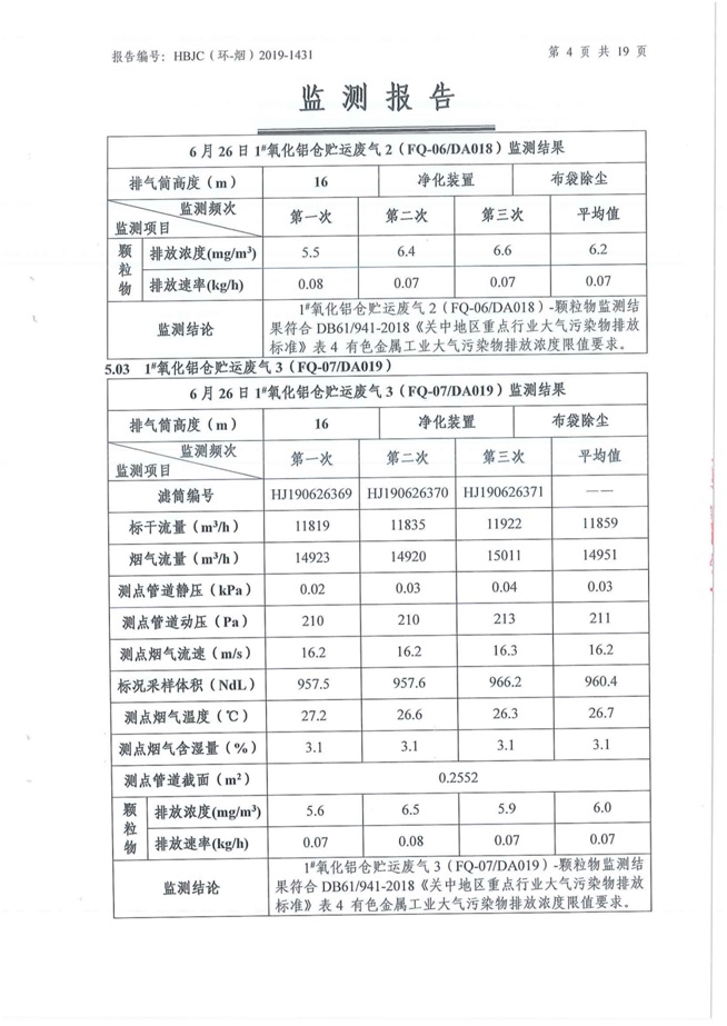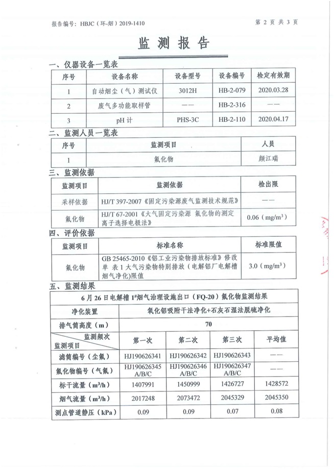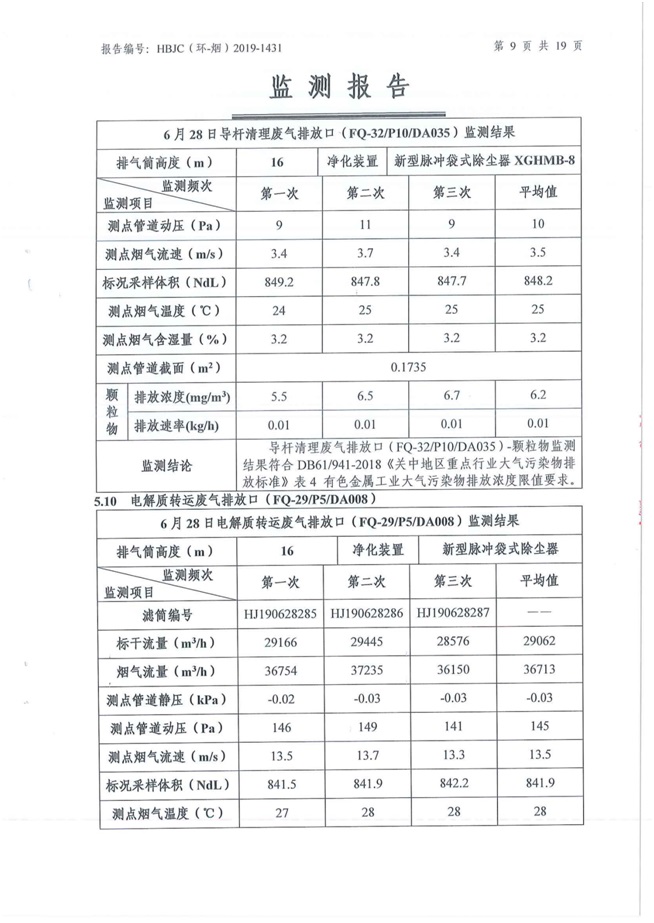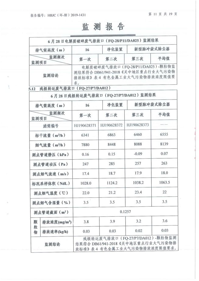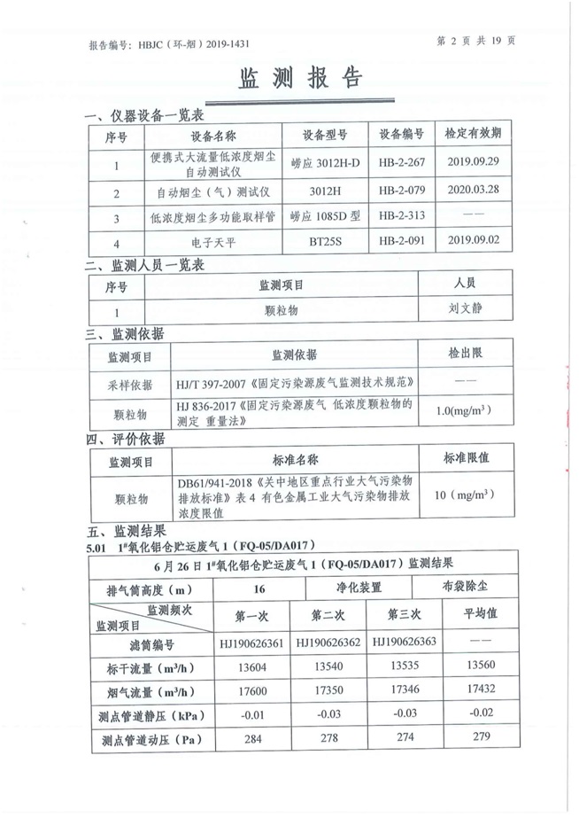 一、基礎信息: 陜西美鑫產業投資有限公司 統一社會信用代碼:91610200567136996Y 法定代表人:高曉兵 生產地址:陜西省銅川市董家河工業園區 聯系方式:09196982605 生產經營和管理服務的主要內容、產品及規模: 美鑫公司在陜西有色、陜西煤化兩大集團的正確領導下,在銅川市委、市政府的關心支持下,充分利用銅川資源型城市轉型政策,依托園區區位優勢,擬投資150億元,建設年產30萬噸預焙陽極、120萬噸煤礦、30萬噸鋁鎂合金及配套動力站、20萬噸鋁深加工、年吞吐量500—800萬噸物流園等循環經濟項目。該集群項目已被列入《陜西省國民經濟和社會發展第十二個五年規劃綱要》,為陜西省“58123”項目之一。美鑫公司以循環經濟為路徑,堅持經濟增長與環境保護協調發展,聚合資源與資本,走綠色發展、清潔發展、低碳發展的循環經濟轉型升級之路。 陜西美鑫鋁鎂合金分公司采用的500kA預焙陽極電解槽,自動化程度高,電解槽打殼、加料全過程均由微機自動控制,從而使槽罩開啟次數顯著降低,電解槽集氣效率能夠達到99%,大大地減少了煙氣無組織排放。項目配置了2套電解煙氣凈化系統,經捕集的煙氣通過排煙支管進入排煙總管,采用電解鋁生產原料—氧化鋁吸附阻濾煙氣中的氟化氫氣體及含氟煙塵,吸附后的載負氧化鋁進入袋式除塵器,經氣固分離后進入石灰石—石膏脫硫系統脫硫。 陜西美鑫產業投資有限公司鋁鎂合金分公司2019年2季度自行監測如下: 二、監測方案: 1 大氣污染源監測
