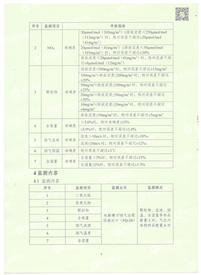 (1)監測指標:顆粒物、二氧化硫、氮氧化物、含氧量、煙溫、流速、含濕量。 (2)監測點位:3個電解煙氣出口(現用一個排口)分別進行比對監測。 (3)監測頻次:每季度監測一次,連續監測1天,每天3-6次。 1.2電解槽煙氣治理設施總排口煙氣自行監測