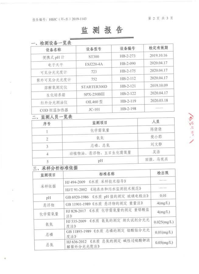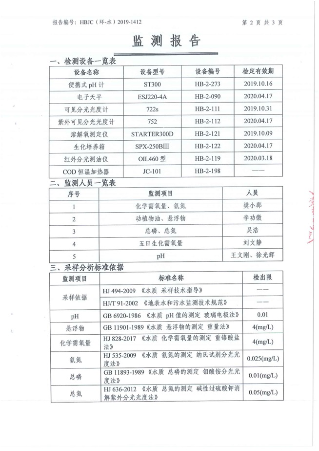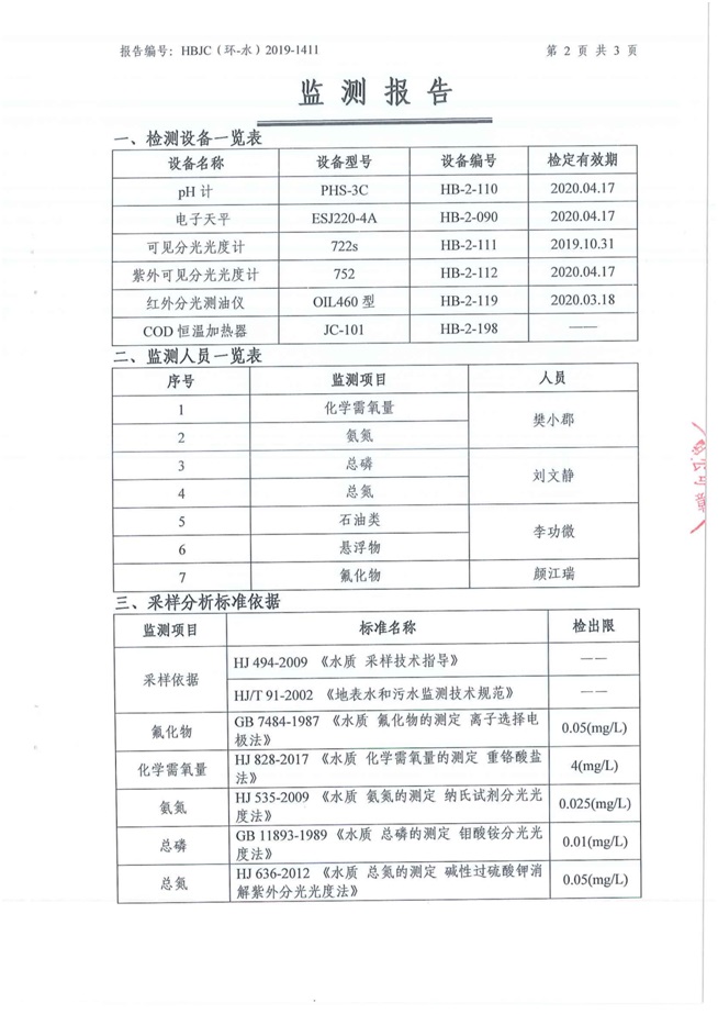 (1)監測指標:化學需氧量、氨氮、懸浮物、總磷、石油類、氟化物、總氮。 (2)監測點位:生產廢水排放口。 (3)監測頻次:每月監測一次,監測1天,每天監測1個水樣。 3廠界噪聲監測