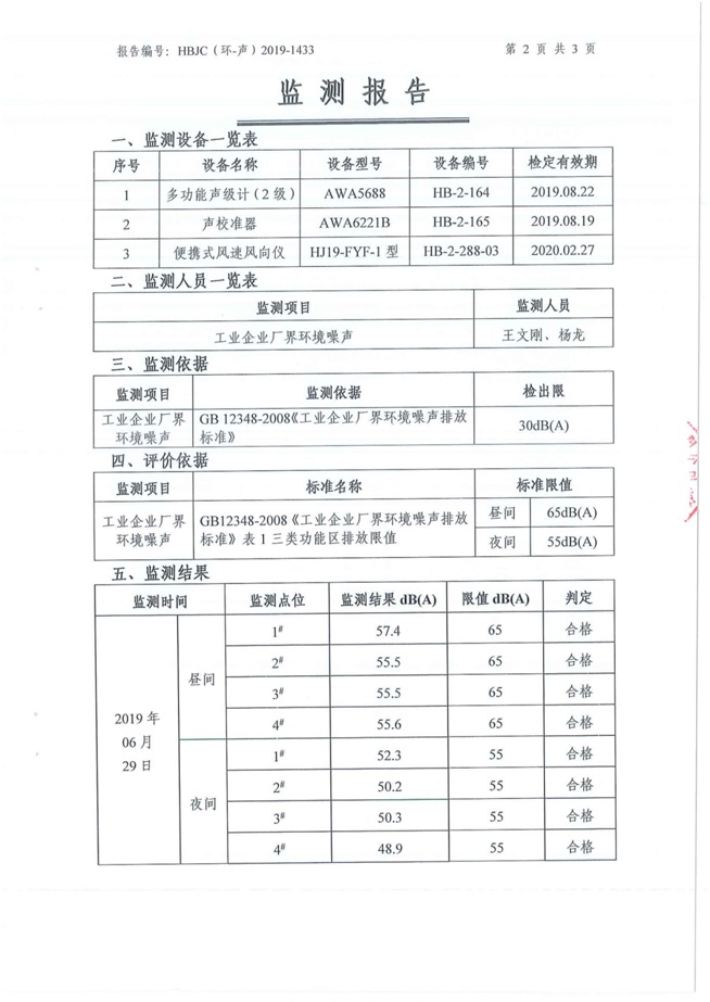 (1)監測指標:等效連續A聲級。 (2)監測點位:廠界四周設置4個監測點位。 (3)監測頻次:每季度監測一次,監測1天,晝夜各監測1次。 三、監測報告: