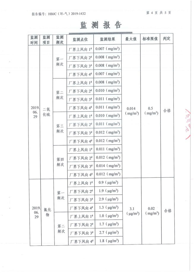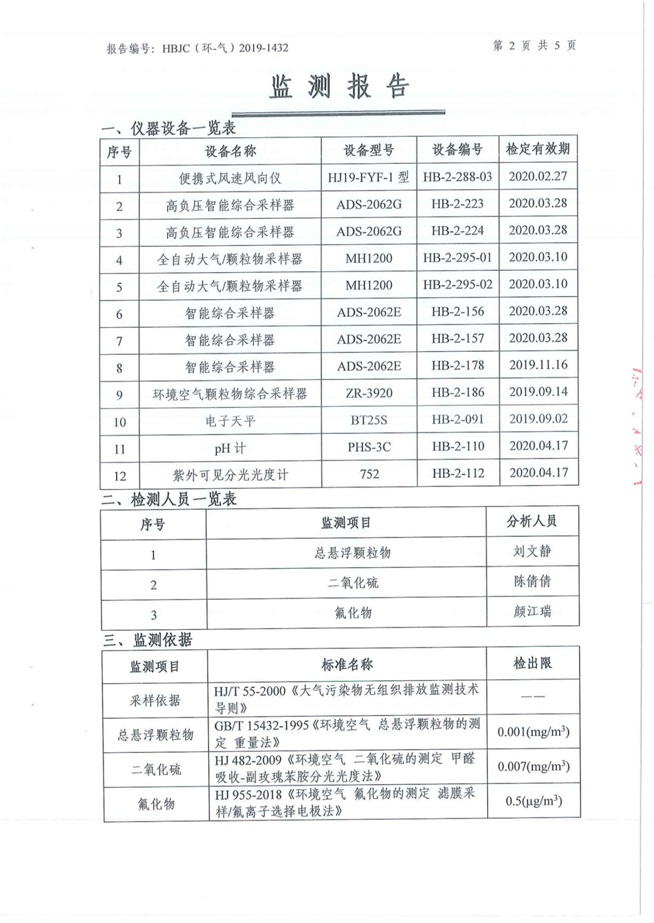 (1)監測指標:顆粒物、二氧化硫、氟化物 (2)監測點位:廠區上風向設1個監測點、下風向設3個監測點。 (3)監測頻次:每季度監測一次,連續監測1天,每天4次。 2 水污染源監測