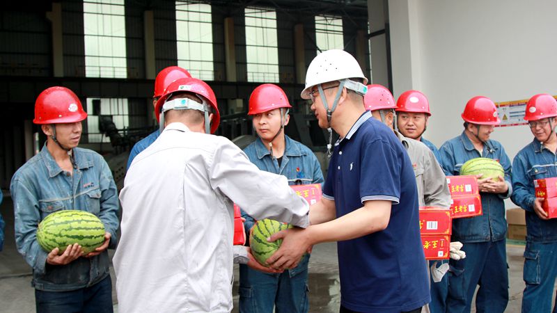 在鋁鎂合金分公司一通廊,公司領導李書平、寧文衛,監事會主席王志鋒與電解兩車間干部職工一起,從園區領導手中接過飲料、茶葉、西瓜、冰糖等夏季消暑降溫物品。禮輕人意重,通過開展送清涼活動,充分體現了管委會“服務轉型發展、服務入園企業、服務當地群眾”的“三服務”理念,受到廣大干部職工的普遍歡迎和好評。 |