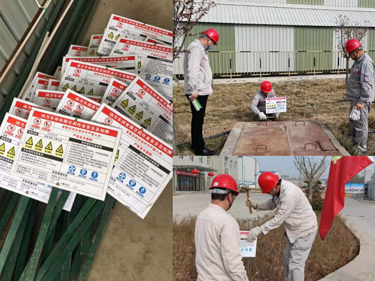 為節約費用,降本增效,車間自己動手制作了安裝支架,并針對綜合管溝、雨水、生產生活水井等重點部位設置安全警示牌、告知牌。車間積極發動組織廣大黨員、職工第一時間安裝到位。安全告知警示語簡潔明了,警示牌色彩鮮艷,起到良好的警示安全告知作用。