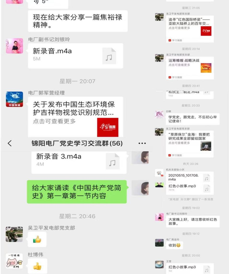 為強化學習交流,讓全體黨員職工參與到黨史學習中來,特創立錦陽電廠黨史學習交流群,通過黨史學習交流群以及工會“1+X+100”工作群,要求大家以“今天我是誦讀人”的新形式,按序每日誦讀原著、講紅色故事,并錄制音頻于群內分享。活動開始后,大家積極響應,相繼對《論中國共產黨歷史》、《毛澤東、鄧小平、江澤民、胡錦濤關于中國共產黨歷史論述摘編》、《習近平新時代中國特色社會主義思想學習問答》、《中國共產黨簡史》、紅色故事、革命先烈先進事跡等學習音頻進行微分享,大大提高了黨史學習教育的吸引力、互動性和感染力。截止63日,分享誦讀音頻共計58篇。