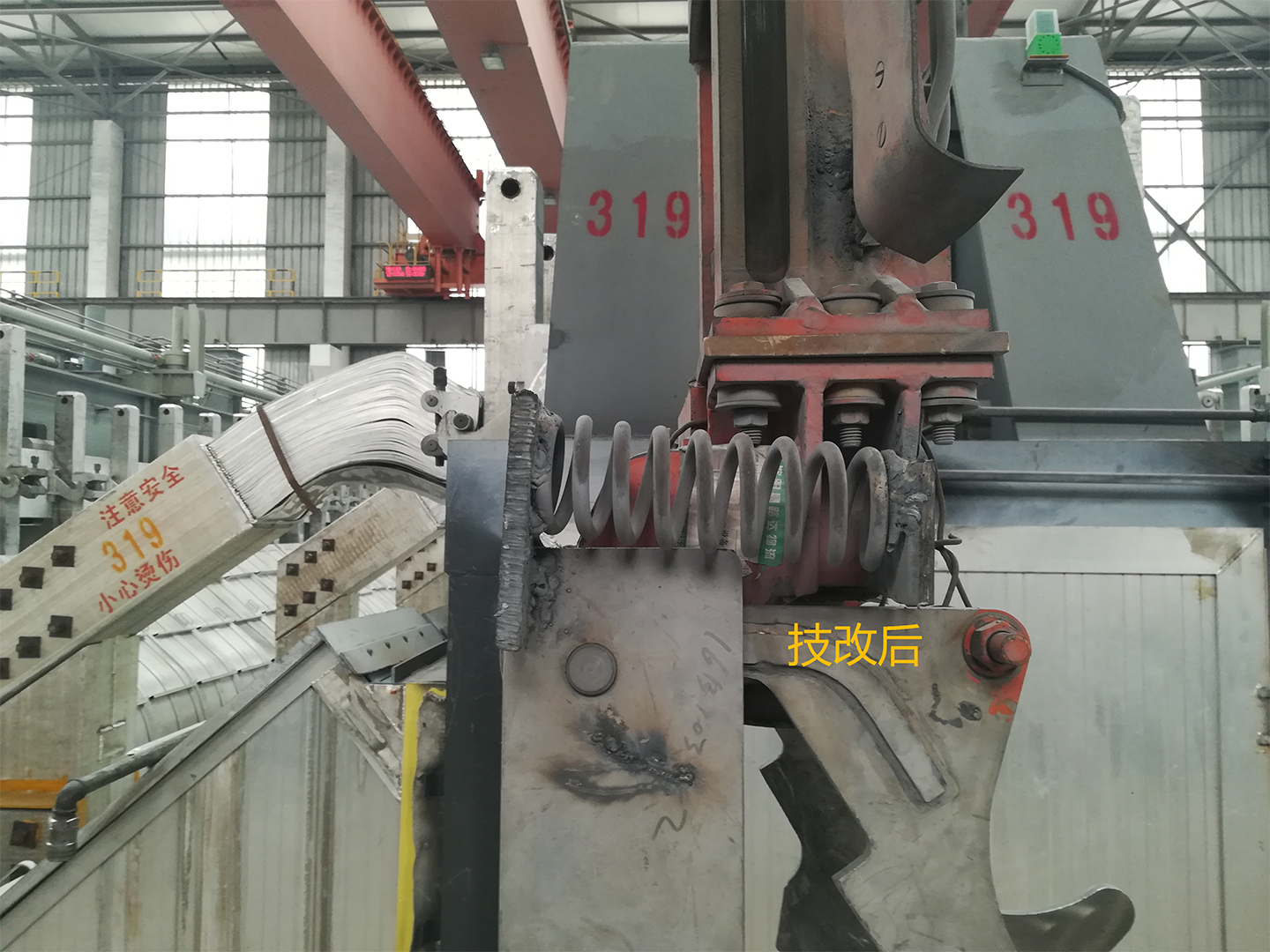 多功能天車是電解生產的主要設備,承擔著車間電解槽的出鋁、陽極更換、母線提升、氟化鋁添加等多項工作任務。 其中陽極更換作業時,技術要求較高,陽極扳手套筒需精確對位、準確下落,稍有偏差將無法套住卡具螺母,則需人工反復校正。天車出廠時自帶的4根陽極“扳手回位頂絲”,因為換極作業中的頻繁使用,容易發生彎曲變形導致無法套入卡具螺母,使用周期較短,需要換極工通過用手推、扳陽極扳手才能套住螺母完成松卸卡具工作。 車間技術革新小組了解到這一情況后,主動承擔起了這項技術改造難題。經過一段時間的觀察、研究、反復試驗,最終技術革新小組利用彈簧的有效伸縮性代替現有“扳手回位頂絲”的方式解決了這一難題。改進后的陽極“扳手回位頂絲”通過將舊彈簧兩邊焊接在頂板上代替原廠頂絲,充分利用彈簧的復位功能,緩沖了扳手在松、緊螺母過程中造成的受力偏移,使陽極扳手能夠迅速、準確套住卡具螺母,使用壽命大大延長。這一技術改造,不僅給維修人員減輕了工作量,降低了維修材料成本,還有效避免了人工手扶夾具出現“夾手”安全事故的發生,為車間的“雙預防”奠定了堅實的基礎。 電解一車間的這次“五小”革新,本著化繁就簡的工作理念,從點滴細微處著眼,將創新作為源動力,打破慣性思維,以修舊利廢為目標,動心、動手、動腦逐步實現技術升級改造,以技術創新打造車間安全生產新理念。 |