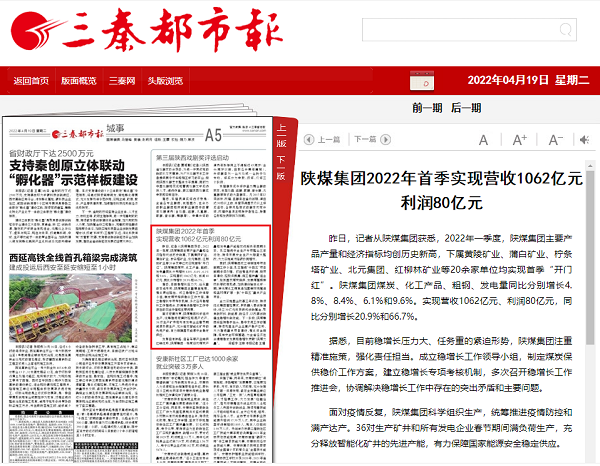 陜煤集團2022年首季實現營收1062億元利潤80億元 昨日,記者從陜煤集團獲悉,2022年一季度,陜煤集團主要產品產量和經濟指標均創歷史新高,下屬黃陵礦業、蒲白礦業、檸條塔礦業、北元集團、紅柳林礦業等20余家單位均實現首季“開門紅”。陜煤集團煤炭、化工產品、粗鋼、發電量同比分別增長4.8%、8.4%、6.1%和9.6%。實現營收1062億元、利潤80億元,同比分別增長20.9%和66.7%。 據悉,目前穩增長壓力大、任務重的緊迫形勢,陜煤集團注重精準施策,強化責任擔當。成立穩增長工作領導小組,制定煤炭保供穩價工作方案,建立穩增長專項考核機制,多次召開穩增長工作推進會,協調解決穩增長工作中存在的突出矛盾和主要問題。 面對疫情反復,陜煤集團科學組織生產,統籌推進疫情防控和滿產達產。36對生產礦井和所有發電企業春節期間滿負荷生產,充分釋放智能化礦井的先進產能,有力保障國家能源安全穩定供應。 發揮自有鐵路、自備車等產業鏈供應鏈優勢,陜煤集團一季度日均煤炭產量和發電量產能釋放遠超去年同期水平。扎實推進安全生產專項整治三年行動,持續開展安全生產大排查大整改,大力實施減污降碳協同增效。 同時,陜煤集團成立領導掛帥項目前期工作小組,扎實推進“十四五”項目前期手續辦理。打出強組織協調、促項目建設、控投資概算、保工程質量“組合拳”,搶抓國家煤炭保供、發展煤基特種燃料等政策機遇,加快建設榆林化學一期、神木煤化工煤焦油加氫制環烷基油和孟村煤礦等一批“十四五”重點產業項目。 全力實施國企改革三年行動,持續優化集團管控模式,積極融入秦創原建設,設立30億元科技研究創新基金,聚焦新材料、新能源、新經濟,以改革創新催生穩增長新動能。下一階段,陜煤集團將堅持穩字當頭、穩中求進工作總基調,持續鞏固生產企業高產穩產態勢,大力推進重點項目建設,強化資金保障,筑牢安全環保基礎,為全省經濟社會健康穩定發展和穩增長貢獻“陜煤力量”。 |