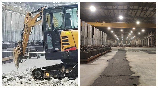 陽極分公司組裝車間裝卸站附近地面由于15T叉車、拖車頻繁行駛碾壓,造成大小坑洼十余處,盡管車間鋪設了厚鋼板對地面進行臨時應急處理,但始終治標不治本,存在一定車輛行駛安全隱患。 為了徹底改善地面環境,消除此項隱患,車間決定集中對裝卸站周邊等廠房殘缺下陷地面進行修復。為了盡量減少對正常作業的影響,車間對生產現場進行細致考量核實,最終決定在最大程度利用現有區域空間的同時,將裝卸站上站工位采取15T叉車人工上線,由人工清理上線后托盤中剩余大塊電解質,隨后將清理后的陽極托盤用于裝成品陽極,并采取3T叉車下線,5T叉車和天車裝盤,最后將裝好的成品陽極送往鋁鎂合金分公司電解車間使用。在地面修復過程中,現場作業環境復雜,存在叉車、拖車、天車等交叉作業情況,車間由專人負責現場安全監管,拉起警戒線,劃定風險、安全區域,確,F場運行安全可控,在車間和施工人員的協調配合下,僅用11天就完成了地面修復工作,經養護后隨即投入使用,車間生產線恢復正常運行。 車間廠房地面修復工作的順利完成,在美化和改善了車間整體環境的同時,穩定和保證了車間正常生產秩序,為鋁鎂合金分公司充足供應成品陽極和電解質破碎料打下了堅實基礎。 |