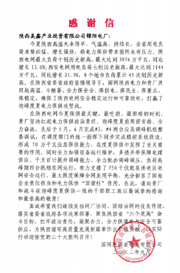 2022年9月,國網(wǎng)陜西省電力有限公司向錦陽電廠發(fā)來感謝信,對(duì)錦陽電廠在迎峰度夏期間奮戰(zhàn)一線戰(zhàn)高溫、斗酷暑、保供電的干部職工予以感謝。 為認(rèn)真貫徹落實(shí)上級(jí)有關(guān)疫情防控、安全生產(chǎn)、電力保供的決策部署,錦陽電廠不懼抗疫保電雙重壓力,科學(xué)應(yīng)對(duì)、精準(zhǔn)施策,提前制定迎峰度夏、可靠供電及電網(wǎng)安全工作方案,建立用電保障24小時(shí)生產(chǎn)現(xiàn)場(chǎng)領(lǐng)導(dǎo)帶班工作機(jī)制,持續(xù)強(qiáng)化運(yùn)行管理,加強(qiáng)設(shè)備巡檢力度及頻次,全面提高設(shè)備健康水平,為迎峰度夏安全生產(chǎn)打牢堅(jiān)實(shí)基礎(chǔ)。在國網(wǎng)陜西省電力有限公司及美鑫公司的大力支持和關(guān)懷下,電廠全體職工及外委單位同心同向、沖鋒在前、攻堅(jiān)克難、堅(jiān)守陣地,在做好鋁鎂合金可靠供電的前提下,全面打贏保安全、保供電、戰(zhàn)疫情攻堅(jiān)戰(zhàn)! 接下來,錦陽電廠將一如既往扛起責(zé)任,以昂揚(yáng)的斗志、堅(jiān)定的信念,全力保障電力安全可靠供應(yīng),以優(yōu)異的成績迎接黨的二十大勝利召開。 |