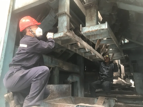 5月中旬,隨著陽極分公司組裝車間1#電解質清理機技改完成和試運行結束,困擾車間電解質清理的“桎梏頑疾”終于得到了有效解決。去年3月,車間對2#清理機進行了嘗試性改造,改造后不斷調整技術參數、優化作業方式、總結運行經驗。今年3月底,結合2#清理機改造經驗,車間又對1#清理機實施了改造,目前2臺清理機均已投入使用,設備運行結構更加穩定安全,故障率顯著降低,職工勞動強度大大減輕,清理效率提升了20%以上。 電解質清理機自2018年投運以來,由于長期運行清理效果逐漸下降,設備故障率居高不下,嚴重影響了車間生產。如何解決電解質清理的“卡脖子”問題,車間經過深入分析,查找確定問題根源。在具體改造實施過程中,車間大膽嘗試創新,借鑒同行業先進經驗增加了破碎錘工位,加裝了5個圓形錘,以3尖錘預破碎、5圓錘精破碎的工作方式,多角度覆蓋破碎擊打點;調整鋼爪定位機構固定位置,確保擊打區域實現全方位;為保證擊打力度,車間模擬增加配重實驗,精準施策;為讓設備運行更加安全平穩,更改殘極組原有的單側固定為兩側固定,改造運行后均取得了良好效果。 下一步,車間將以此次技術改造為契機,積極開展技術課堂講座、崗位技能比武、傳幫帶等活動,著力提升職工專業技能水平。同時,不斷建立健全獎懲管理機制,鼓勵倡導廣大職工為車間技術創新、小改小革等建言獻策,群策群力解決生產難題,全力保障分公司安全生產平穩運行。 |