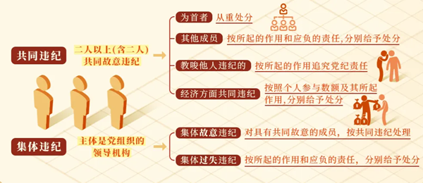 《中國共產黨紀律處分條例》規定,共同違紀主要是指二人以上(含二人)共同故意違紀。 為首者,主要是指在共同違紀中起主要作用的黨員。除非《條例》另有規定,對為首者,從重處分。 對其他成員,按照其在共同違紀中所起的作用和應負的責任,分別給予處分。 教唆,主要是指以授意、慫恿、勸說、利誘或者其他方法故意唆使他人違紀,行為人必須具有教唆他人實施違紀的故意。教唆他人違紀的,按照其在共同違紀中所起的作用追究黨紀責任。 值得注意的是,新修訂的《條例》將經濟方面共同違紀的,由按照“個人所得數額”調整為按照“個人參與數額”及其所起作用,分別給予處分。還規定對共同違紀的為首者,情節嚴重的,按照共同違紀的總數額處分。這一數額認定規則,與刑法規定的共同犯罪中各行為人犯罪數額通常以行為人實際參與數額計算的做法,實現了貫通。 與共同違紀不同,集體違紀的主體是黨組織的領導機構。集體違紀包括集體故意違紀和集體過失違紀兩種情況。黨組織領導機構集體作出違犯黨紀的決定或者實施其他違犯黨紀的行為,對具有共同故意的成員,按共同違紀處理;對過失違紀的成員,按照各自在集體違紀中所起的作用和應負的責任分別給予處分。 需要留意不能以“集體領導”“集體負責”“集體研究”等為借口,不追究集體作出違紀決定或者集體實施違紀行為的領導成員責任。但是,以下兩種情形不屬于集體違紀:一是個人違反民主集中制的原則,擅自作出錯誤決定,不能追究集體責任,只能按照個人違紀處理。二是對于在領導機構作出錯誤決定或者實施錯誤行為時,沒有參與或者表示反對的,不視為集體違紀人員。 |