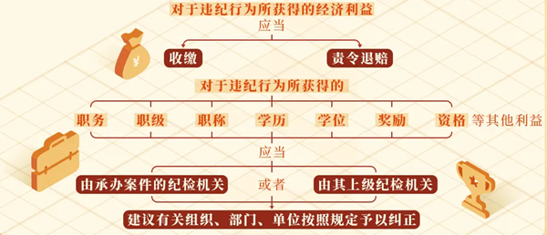 《中國共產黨紀律處分條例》對于違紀行為所獲利益如何處理作出了規定。主要分為兩種情況—— 對于違紀行為所獲得的經濟利益,應當收繳或者責令退賠。對于主動上交的違紀所得和經濟損失賠償,應當予以接收,并按照規定收繳或者返還有關單位、個人。 依照《中國共產黨紀律處分條例》《中華人民共和國公職人員政務處分法》及相關指導性案例,在追究黨紀責任時,處置涉案財物的主要方式為“收繳”和“責令退賠”;在追究監察責任時,處置涉案財物的主要方式為“沒收”“追繳”和“責令退賠”。其中,追究黨紀責任時對違紀所得予以“收繳”,相當于追究監察責任時對違法所得予以“沒收”和“追繳”。 “收繳”通常針對的是實施違紀違法行為所獲得的財物及其孳息收益,“責令退賠”通常針對的是違反規定揮霍浪費國有資產,如公款吃喝、公款旅游以及違反規定亂罰款、亂收費獲得的財物等,責令被審查調查人將違紀違法所得的財物予以歸還,財物已經被消耗、毀損的,應當用與之價值相當的財物予以賠償,責令退賠的財物直接退賠原所有人或原持有人,無法退賠的上繳國庫。 對于違紀行為所獲得的職務、職級、職稱、學歷、學位、獎勵、資格等其他利益,應當由承辦案件的紀檢機關或者由其上級紀檢機關建議有關組織、部門、單位按照規定予以糾正。 這里的“有關組織、部門、單位”,主要是指對違紀行為所獲得的職務、職級、職稱、學歷、學位、獎勵、資格等其他利益有權予以糾正的組織、部門、單位。 同時,結合《條例》第三十七條、第三十八條規定,對違紀后下落不明的黨員,黨組織作出處分決定前死亡的黨員,或者死亡之后發現曾有嚴重違紀行為的黨員,經調查確屬其實施違紀行為獲得的利益,也應當依照上述規定處理。 |