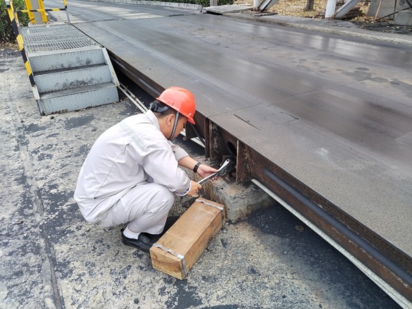大宗原材料進出場的精準計量是企業生產平穩運行的關鍵環節。7月18日14時20分,質檢計量中心接到緊急報告:陽極磅房磅秤突發傳感器傾斜、秤體移位故障,導致石油焦運輸車輛無法正常過磅。時值高溫保供關鍵期,若不及時排除故障,將直接影響物料流轉效率,甚至延誤生產進度。 靠前指揮強部署 爭分奪秒搶進度 故障就是命令!中心領導班子迅速反應,第一時間趕赴現場指揮調度,并抽調技術骨干成立搶修小組。搶修人員冒著高溫,對磅秤進行全面排查,迅速鎖定故障原因——由于頻繁使用、且持續高溫導致磅秤限位間隙縮小,車輛在磅秤上急停致使磅秤傳感器偏移、固定限位松動,造成磅秤部分限位失靈!氨仨氃2小時內恢復運行!”中心領導下達硬性指令。在安全管理人員的全程監護下,搶修人員迅速制定搶修方案:利用千斤頂穩固磅秤中心,多人協同撬動調整位移端,重新校準傳感器并精準調試數據。 協同奮戰保運行 精準調試穩計量 經過1小時20分鐘的緊張作業,15時50分,磅秤計量數據恢復穩定。經反復校驗,誤差值嚴格控制在國家標準范圍內。等候的運輸車輛隨即有序過磅,生產恢復正常運轉。此次搶修比原定預案提前40分鐘完成,最大限度地降低了故障對生產的影響。 |